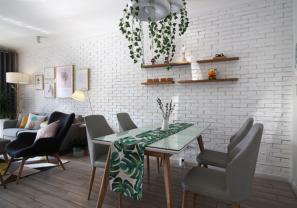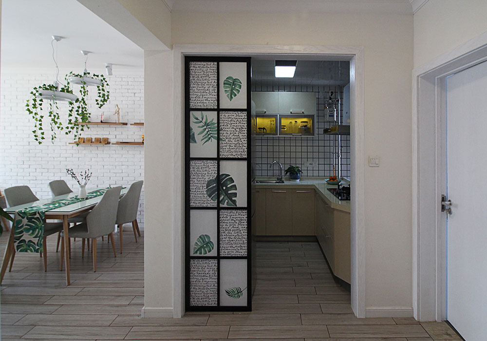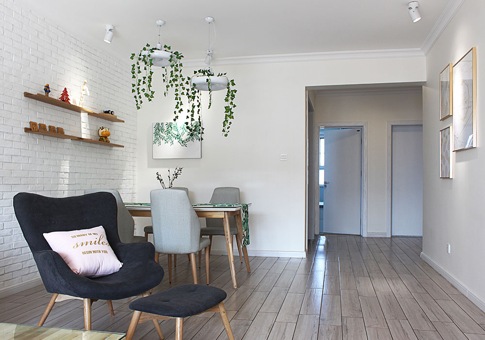 玄关入户后由于面对厨房冰箱部位,特设美观铁艺隔断将其遮挡。入户右手边的鞋柜面积太小以至于储物空间过小,设计师特意设计到顶柜体增加实用功能。客厅餐厅背景采用白色文化砖铺贴打底,并进行挑选隔板和装饰画利用软装来营造出童话小清新般的格调。