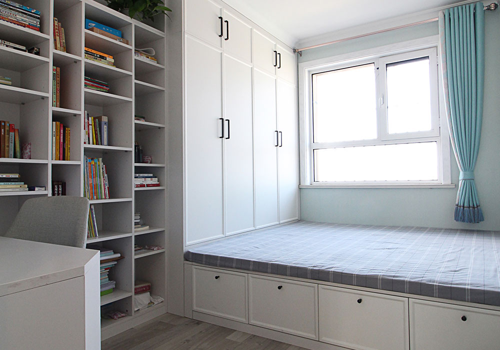 主卧室有别于普通的布局方式将衣柜设计在了飘窗部位,满足实用功能的同时加大了飘窗的舒适实用性能,且使主卧室格局更加方正。由于女主人职业需求,在书房设置了大面积的书架,容量强大同时将空调暗藏其中,整体美观。书房同时兼具客房功能,储物空间强大的榻榻米非常实用。男孩房则设计了上下铺,满足孩子的好动特性可以有很多玩耍空间,满墙铺贴的世界地图壁画,同时也在启迪孩子对未来的向往。